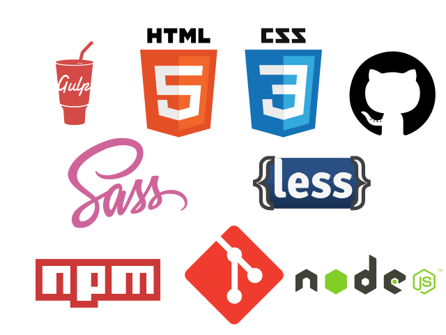 HTML5, CSS3, Javascript (ES6), pre-processors (Sass, Less), gulp, git,